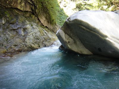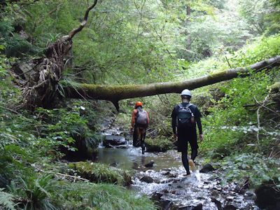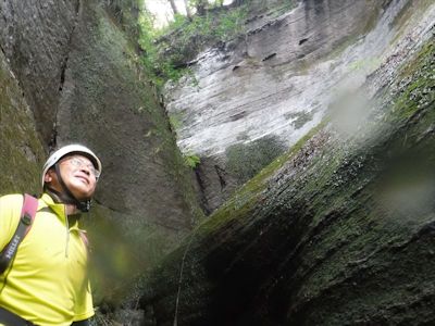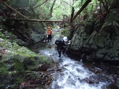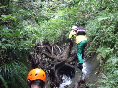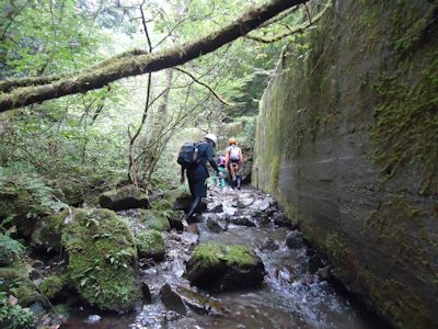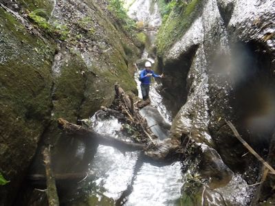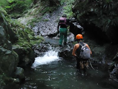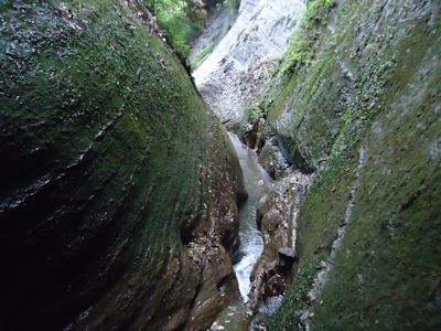 しばらく遡行すると、両岸が崖としてそびえたってくる。川幅はさらに狭まった感があり、数10pまで狭くなり、すぐ両脇が壁となる。細く穿たれたクレバスの底のような場所を登っていく。狭いところでは身体を横にして通らないといけないところもある。時々滝があるが、両岸が極端に狭まっているので、上がるのにそれほど苦労はしない。