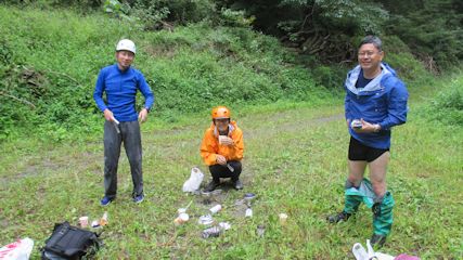 午後2時前、林道に上がり、しばらく上流部に歩いて昼飯を食べられるような広い河原を探すが、なにぶんにも小溪で広々とした河原などが見つからない。仕方なく、林道わきにちょっとした草地があったので、ここで昼飯にする。