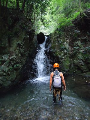3時間ほど歩いて今日の終了点の2つの滝に到達する。2m滝をクリアすると、次が2段5m。これを直登して終了。すぐ横は林道なので詰めも藪漕ぎもない。