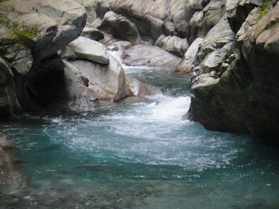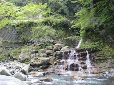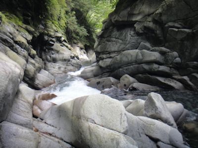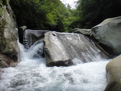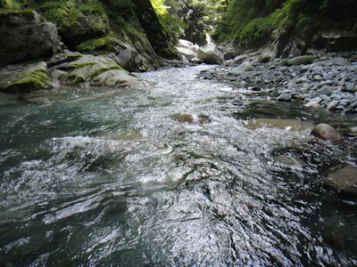 10時半入渓。奥多摩と同じように苔のついた緑色の岩々の間を透明な水が流れている。水は冷たいが、水量が少ないので、先月行った奥多摩の海沢川よりはまだ温めのようである。沢幅も小さい。小溪である。