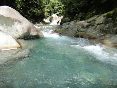 この沢の特徴は、緑色の淵の連続と、白い巨石である。河原と川の中には、大きな白い石がゴロゴロしている。この石は何と言う岩なのだろうか。