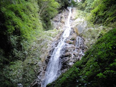 しばらく歩くと再び左から巨大な滝を落として向山沢が入る。この向山沢の大滝は高さ70m。水量は少ないが斜度は急である。