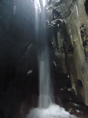 間滝はその最奥にかかっていた。狭い岩壁の間を流れ落ちている。そこは本当に地が裂けたようなクレバス状の空間で、暗い。間滝は2段の滝らしく、今見ているのは下段の滝、5mくらいあるだろうか。この上に上段の滝がかかっているそうだが、下からは見えない。
