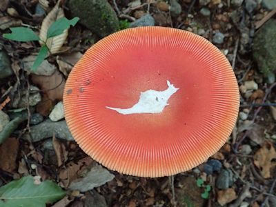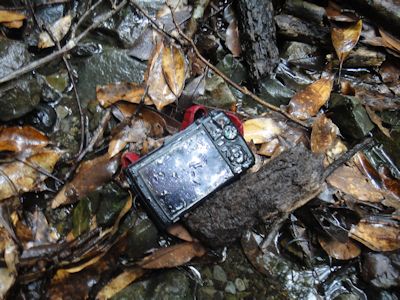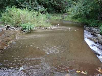 堰を超え、さらにしばらく登ると、沢は突然、林道と交差した。林道上を川が流れているのだ。午後1時前。