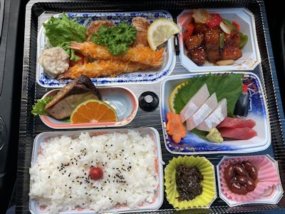 弁当は、近くのリゾートホテル「大黒」の仕出し弁当で、確かに豪華である。刺身まで入っている。刺身には保冷剤が乗っかっていて、しばらくは鮮度を保てるようになっている。