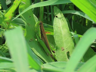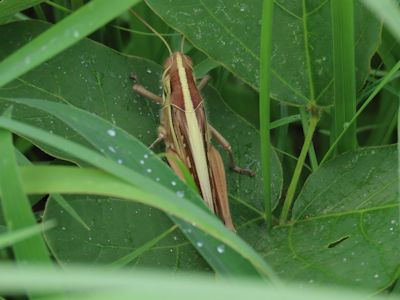ツチイナゴ(多分)。背中のストライプが凛々しいが、こんなに目立つ
