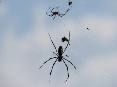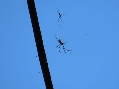 ジョロウグモが高いところに巣を張る。大きいのがメス、