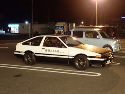 昔、串間市のスーパーの駐車場で、「藤原とうふ店」と書かれた黒白ツートンのパンダトレノー(多分)が停まっていたことがあるのだが(右写真)、このアニメを見てようやくあの車の謎が解けた。