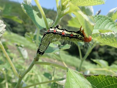 フクラスズメ(蛾)の幼虫が葉を食べる (宮崎県串間市) |