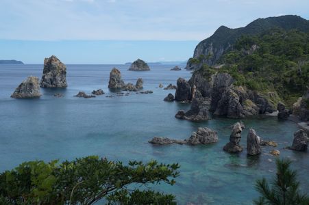 青海島自然探求路から見える、海からそそり立つ奇岩群