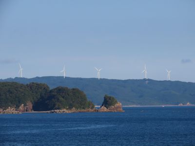 志布志湾から、私が働く風力発電所の風車が見える