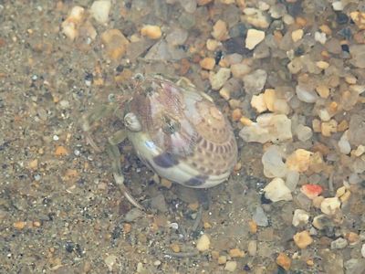 干潮時のキワ・ラ・ビーチの潮だまりは生き物天国。ヤドカリ、貝が