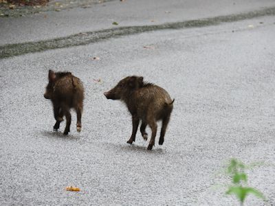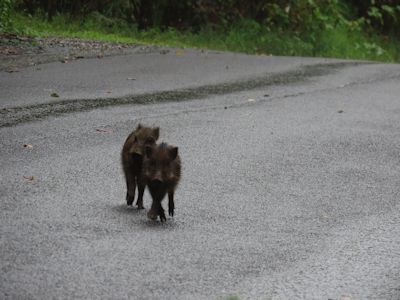 数分後、二頭のウリ坊が、親イノシシ(多分)と同じところから現れ、道に出た。私からは30mくらいの距離だ。