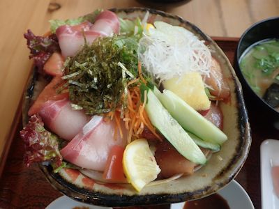 12:5三崎着。道の駅佐田岬ミュージアムの食堂風車にて、以前食べておいしかったちりめん丼じゃこ天付き1200円を食す。
