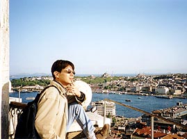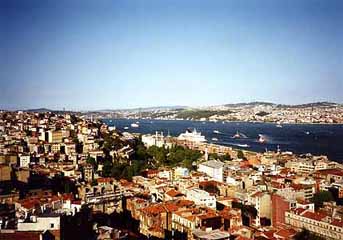 | ガラタ塔から、イスタンブールの街並みとボスポラス海峡を見下ろした図。 イスタンブールの家々は、茶色の屋根を持ち、上から見ると非常に美しい。 |