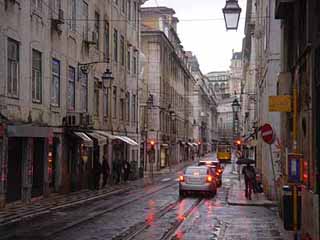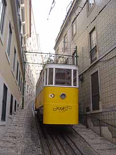 ポンバル公爵広場を抜け、閑散としたリスボンの目抜き通り、リベルターデ通りをひたすら南下する。ビルが立ち並ぶ。オフィス街らしい。店はどこも閉まっている。車は走っているが、朝9時半の通りに人はほとんどいない。黄色い小さな葉しか残っていない冬枯れの街路樹が、一直線に走る道路を彩っている。日本大使館の入ったビルを通り過ぎ、レスタウラドーレス広場手前からケーブルカー、ラウラ線で急勾配を上がる。家と家の狭い隙間にレールが敷設され、小さな車両は、急勾配をギリギリと上がっていく。