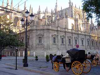テルミナルの近くの停留所からバスに乗ってプエルタ・デ・へレスへ。セビーリャといえば、カテドラルである。ヨーロッパで三番目、スペインで一番大きい教会が、このセビーリャのカテドラルである。その象徴であるヒラルダの塔は、12世紀にイスラム教徒により建てられたモスクの尖塔。つまり、このカテドラルは、キリストとイスラムが一部融合しているのだ。(イスラムとキリストの融合といえばコルドバのメスキータが最も有名ですが)
