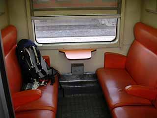 ようやく17:15にフェズ方面への列車が出発。2等は、8人一部屋のコンパートメント。人工皮革のシートは、悪くない。