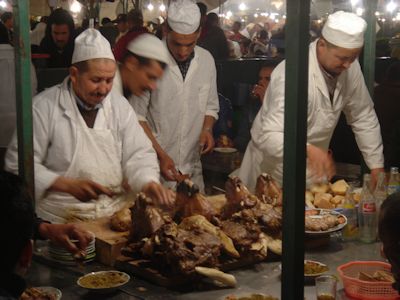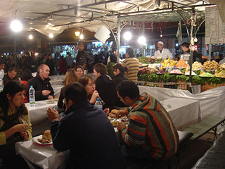 日が暮れる。夜になって再びフナ広場に行くと、様相が一変している。サッカー場くらいの広さはあろうかというエリアに、屋台食堂が延々と続いている。無数の調理台、テーブル、ベンチ、天幕、そしてライトは昼間のように明るい。これを毎日夜な夜な設営して徹営するのだろうか。