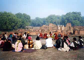 サールナートは、ヴァラナシの北東約10kmのところにある、仏教の聖地である。現在のインドはヒンズー教徒が大部分を占めるが、ご存知のようにインドは仏教発祥の地である。ブッダは紀元前5世紀ごろ、インド国境に近いネパールのルンビニーで生まれ、解脱・悟りを求めて世俗の生活を捨て苦行の旅に出る。そしてインド北部ブッダガヤの菩提樹の下で深い瞑想に入り、そこでついに覚りを得た。それが覚者・ブッダの誕生である。そしてさらに歩き続け、当時宗教家が多く集まっていたというヴァラナシへ向かい、サールナートで初めて自分の覚った真理を語ったと言われている。