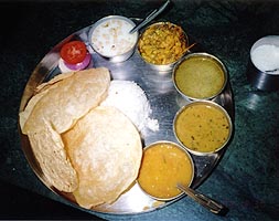 その後、近くの大衆食堂に入り、インドでの「初カレー」を食べた。「ターリー」という定食を頼めば、3,4種類のカレーと、白飯、ナンやチャパティーが大皿に乗って出てくる(写真)。これがわずか30ルピー(約75円)。