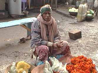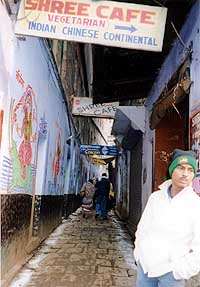 狭い路地の両側には、いろいろなものがある。店があり、普通家がある。ところどころにリンガ(男根形の石、シヴァ神のシンボル)があり、通りかかる人々が立ち止まっては祈っている。そしてヴィシュヌの壁画がある。極彩色の看板がケバケバしく、横断幕のようなものもかかっている。狭い路地を塞ぐように牛がいる。神聖な動物である彼らは、悠々自適のように見える。どんなインド人も、牛を邪険に扱う者はいない。