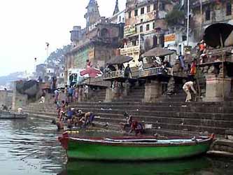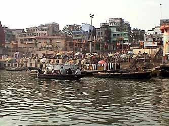 河には無数のボートが浮かんでいる。日本人年配団体観光客のボート、白装束の集団を乗せたボート(河に遺灰を流している遺族だろうか)。私も船頭と値段交渉をして、ダシャシュワメード・ガート付近からボートに乗って河に漕ぎ出した。よく見ると、岸近くに子ヤギの死体が浮かんでいる。ここでは死んだ動物もどんどん流れていく。そして人間でも子供は火葬せずにそのまま流すのだという。船は川の流れに乗って下流に向かう。河から岸を眺めると、ガートが延々と続いている様子が見て取れる。各ガートは、インド各地の様々なヒンズー神を祭っているそうである。