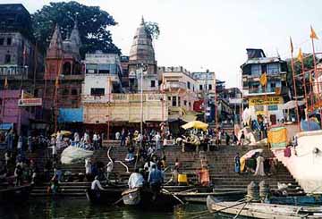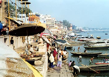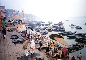 (注1)「ガート」とは、階段状の斜面になってガンジス川に没している堤のことで、ここヴァラナシでは、ガンジス川西岸に60ものガートが延々と並んでいる。それぞれのガートでは、それぞれの地域のそれぞれの神が祀られている。ここで人々は沐浴する。