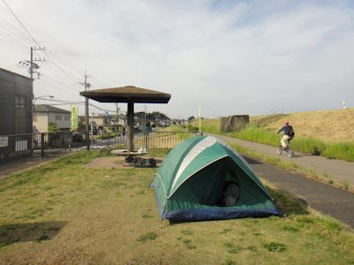 旅初日野営地。流山の休憩施設。右の土手は江戸川(千葉県流山市)