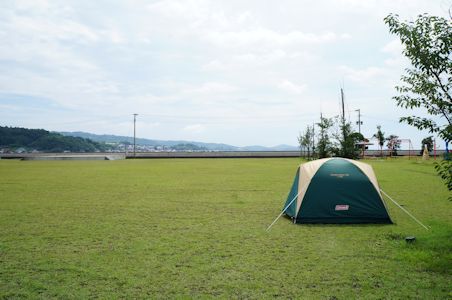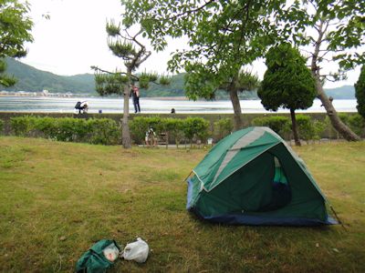 境港の弥生公園。運河のすぐ脇にある。テントのポールが折れたため、