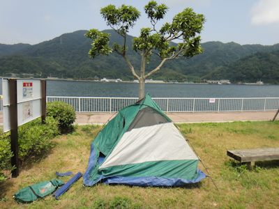 鳥羽では、私がテント泊した公園が、地域の皆さん(年配の人が多い)の朝のラジオ体操の会場となっており、私は体操場所のすぐ近くで野営していて、6時にはすでにNHKラジオが大音量で流れ始めたため、私はテントから起き出した。すると、ラジオ体操の取りまとめ役の自治会会長みたいなおじさんが、私に謝ってきた。