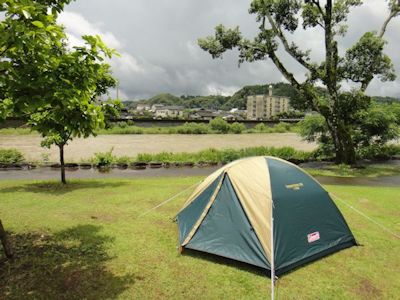 中川原公園キャンプ場。向こうの濁流は球磨川(熊本県人吉市)