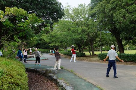 鳥羽の市民の森公園で朝、ラジオ体操をする人々(三重県鳥羽市)