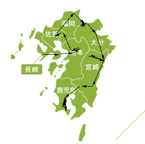 長崎→島原→熊本→阿蘇→(熊本)→鳥栖・佐賀競馬場→吉野ヶ里→佐賀→中津・犬ヶ岳→別府→延岡→高千穂→(延岡、宮崎)→鹿児島→開聞岳、知覧