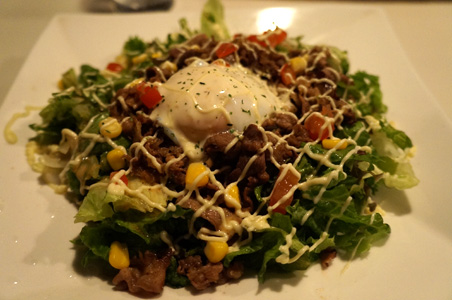 さて、シシリアンライスとは何か。モノの本によれば、これは佐賀市街に昭和50年ごろに登場した料理で、ご飯の上に生野菜、甘辛く味付けされた肉が載っていて、マヨネーズが網のようにかかっているワンプレートご飯もの料理である。