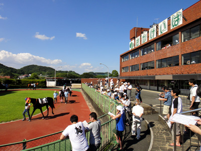 パドックは小さいが、地方競馬では普通の大きさだ。出走頭数はほとんどのレースで8〜10頭くらいなのでそれ相応のパドックだ。