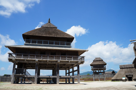 高床式、半地下式の住居や倉庫、高見櫓、司祭のための建物などが復元されてある。