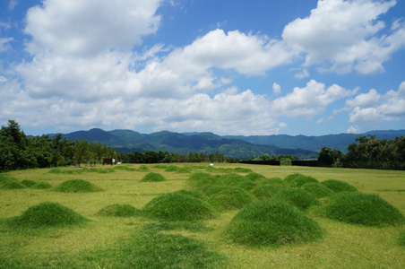 さらに北へ歩くと、もう一つの甕棺墓列が、芝生の平地にずらりと広がっている。