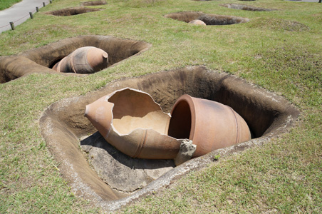 そして遺跡のハイライトは、北墳丘墓。こんもりと方形に積まれた土の下には、身分の高い人々の墓があり、それを発掘した状態で見ることが出来る。通常の甕棺墓列よりも一つ一つの甕棺が距離を持って埋葬されている。ここは空調完備の展示館となっていて、弥生時代の死者埋葬についての説明や副葬品などのパネル説明がされると同時に、中央にはその発掘された墓列を見ることが出来る。すばらしい。