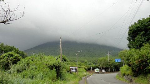 登山口へ向かう道に、「かいもん山麓ふれあい公園」と書かれたアーチがあり、そこをくぐる。目の前に立ちはだかる開聞岳は、最悪なことに中腹から上は完全に雲で覆われてしまっている。美しい円錐形の開聞岳が眺められないばかりか、このまま登っても山の上からの展望はひょっとしてゼロじゃないか?と大いに気になる。海沿いにそびえる開聞岳、その登山の一番の醍醐味は、見渡す限りの東シナ海、屋久島まで見渡せるという、山頂からの絶景なのである。