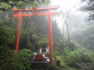 山頂直下に御嶽神社がある。神社の鳥居の赤だけが鮮やかだ。周りは完全に白い靄が覆っている。