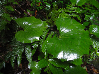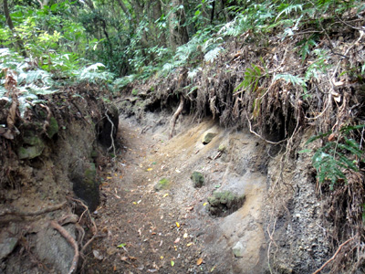 ともかく、登山口(二合目)からいよいよ登山道を登り始める。始めは森の中の道。道は狭く、土は火山礫で、丸く軽石のようにボソボソ、ザラザラしているためズルズルと滑るので歩きにくい。
