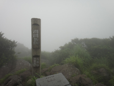 13時、山頂に立つ。二合目の登山口からちょうど2時間。開聞岳924mの標柱。しかし、予想していたことだが、眺望はゼロ。白く立ち込めたガスの只中で、白しか見えない。天気がよければ、ここからは、東シナ海が一望でき、紺碧の海に屋久島まで見通せるという、その名の通りの絶景が広がっているはずなのである。これ以上の落胆があろうか。これほどの無念さを感じたことが最近あったか(泣)。千葉からここ鹿児島県は薩摩半島の南端までやって来て、白いガスにより何も見えないとは。日頃の行いが悪いということか。