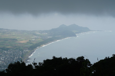 東には海が広がる。東シナ海。海に突き出た長崎鼻。だがそれ以上先は雲のため見通せない。長崎鼻の手前に川尻の街が広がっている。