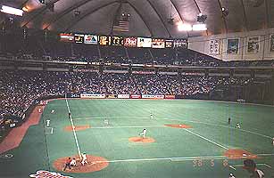 | メトロドーム内部。 1998年5月8日、ツインズ対ニューヨーク・ヤンキース戦を見に行った。 マウンド上で投げているのは、当時ヤンキースにいた伊良部投手。この試合、伊良部は勝ち投手となった。 |