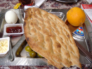 このホテルは朝食付き。ちょっと固めのアラブパン、ゆで卵、オリーブ、オレンジ、チーズ、シャイの朝食。悪くない。