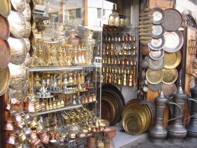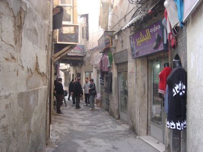 メイン道路から一本路地を入ると、もうそこは迷路。細い道の両側に古い茶色の壁が経てきた年月をさらけ出している。時々店があり、茶色の建物の単調な色合いを一変させる。突然鮮やかな原色や、別の人工色を放つ。中東の旧市街の建物群の単調な色使い、例えばマラケシュであればオレンジっぽい茶色、ここダマスカスでは薄い茶色、その単調な中に、突如絢爛に現れる布地や絨毯の色とりどりの原色、もしくは金銀の金物屋、色鮮やかな果物など、これらの風景と言うか、対照的な色の光景、競演が、中東の旧市街の一番強い印象となる。これはどこの国でも割と同じだ。