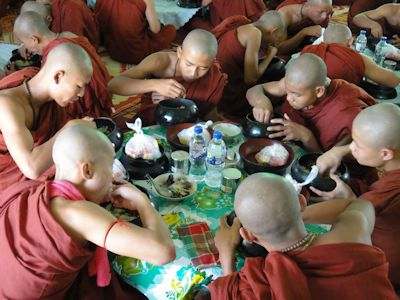 食事する若い僧たち。手で食べる |