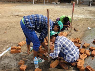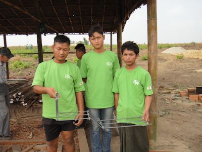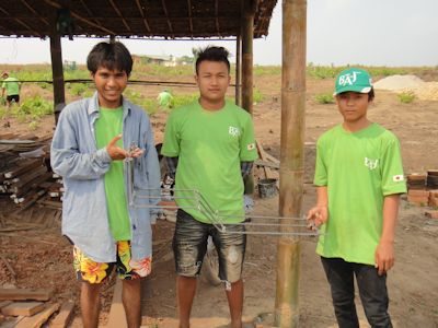 今日は午前中、建設サイトにて実技の試験。3人一組の9グループに分かれ、鉄筋加工とレンガ壁・柱造り。テストだけあってさすがに皆真剣だ。