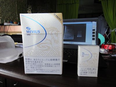 メビウス1mg特別箱 左がカートン、右がタバコ1箱 |